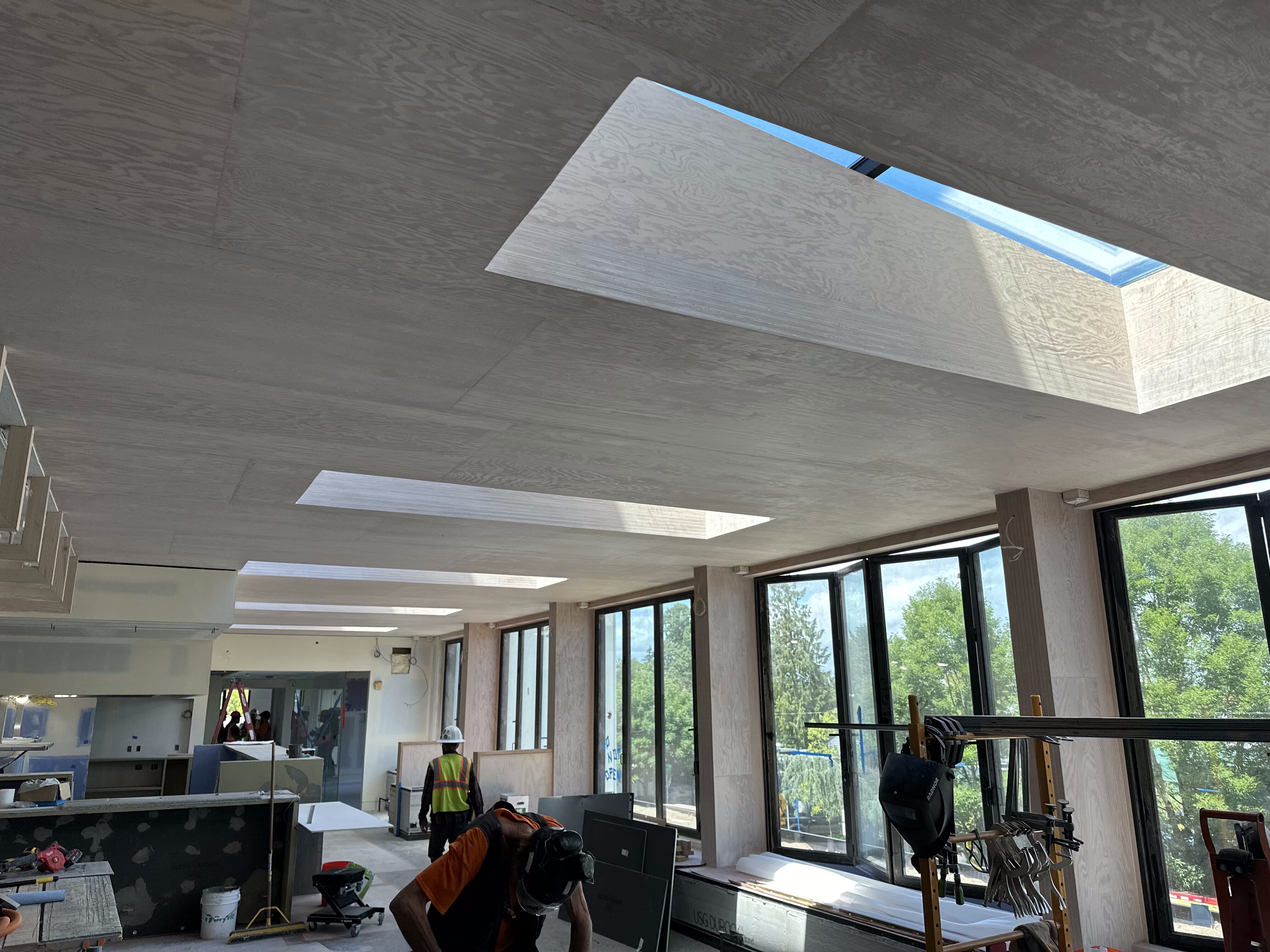LEVER Architecture, the building’s designer, focused on locally-sourced, energy-efficient materials for the project to minimize environmental impact. These sustainable design choices include green roofs, solar panels, stormwater reuse, and low-carbon concrete. “Everything in the project reflects the spirit of innovation,” said Thomas Robinson, founding principal architect at LEVER, in an article from The Oregonian. Paired with these eco-conscious materials, LEVER selected Freres Engineered Wood’s Mass Ply Panels (MPP) to create exquisite exposed ceilings in the lobby and on the second floor.