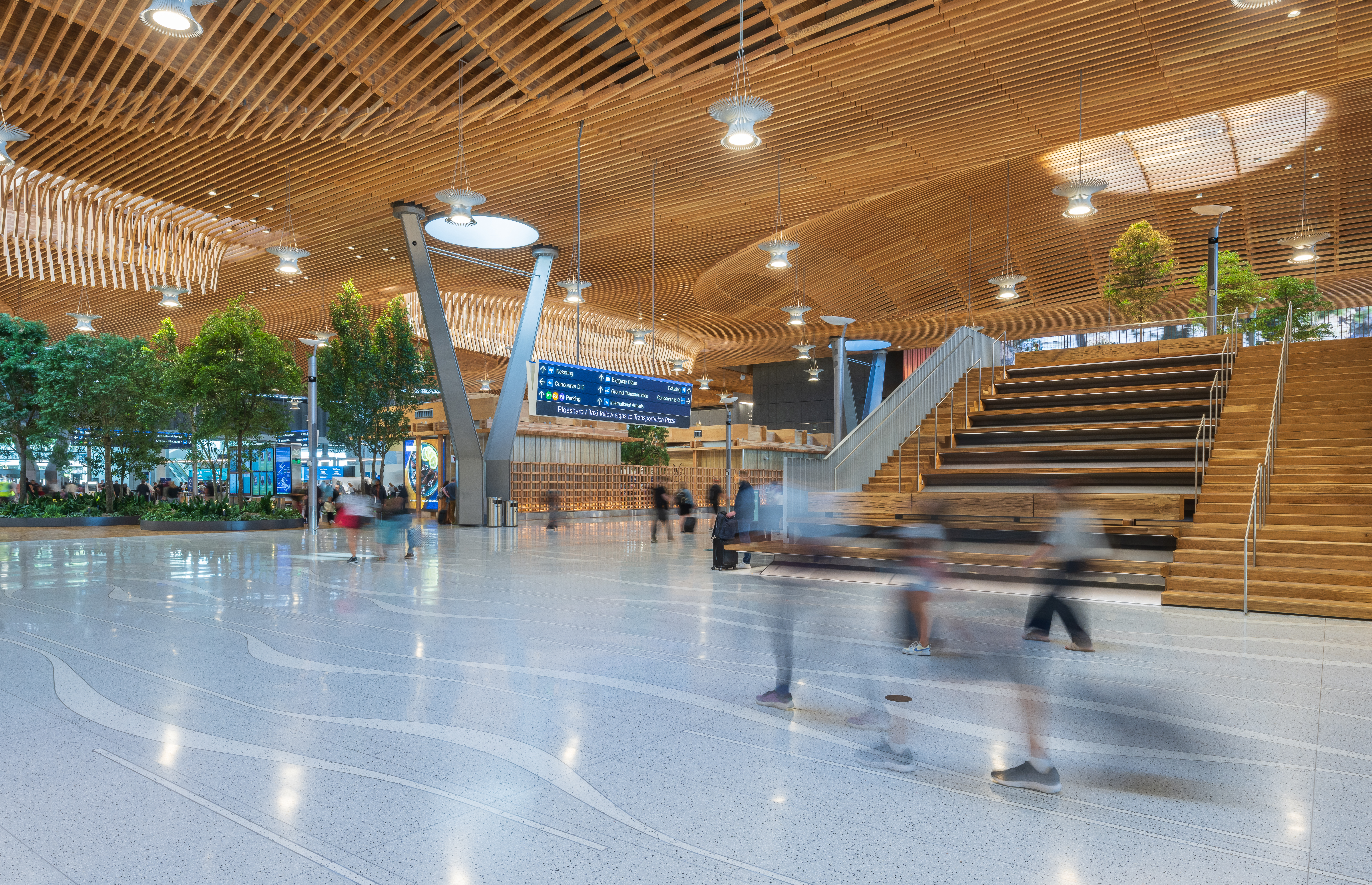 The new main terminal is a modern marvel. Its curved, latticed roof features 2,425 parapet panels around the perimeter to create a unique arched silhouette, evoking a canopy of intertwined branches. The biophilic experience continues below, where guests wander among live trees and plants as sunlight cascades from 49 skylights. Inside, visitors will find a collection of local restaurants and shops, as well as stadium seating where family and friends can relax while awaiting arrivals.